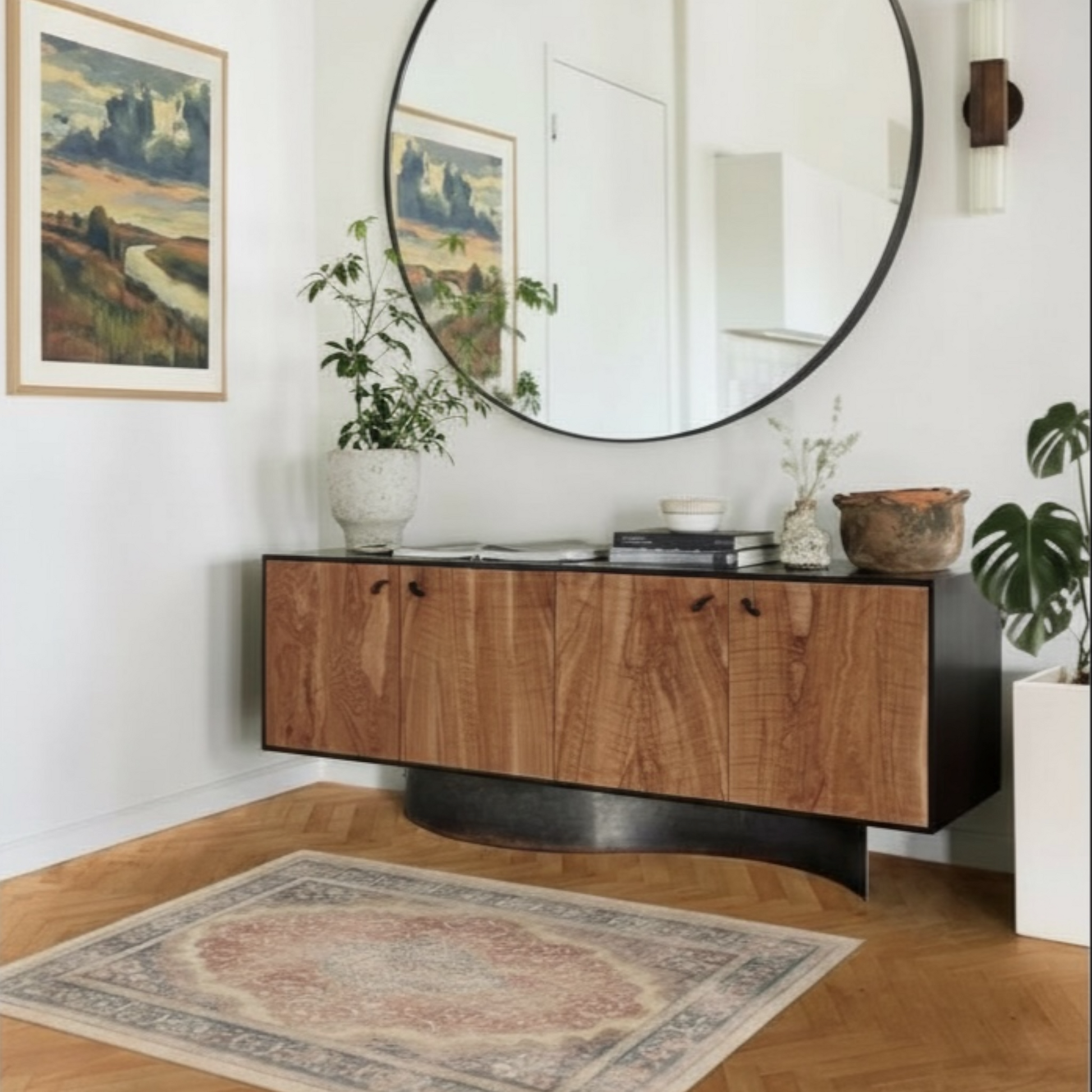 Adaptability: An elegant foundation for formal dining rooms, libraries, or living areas featuring dark wood and leather accents.